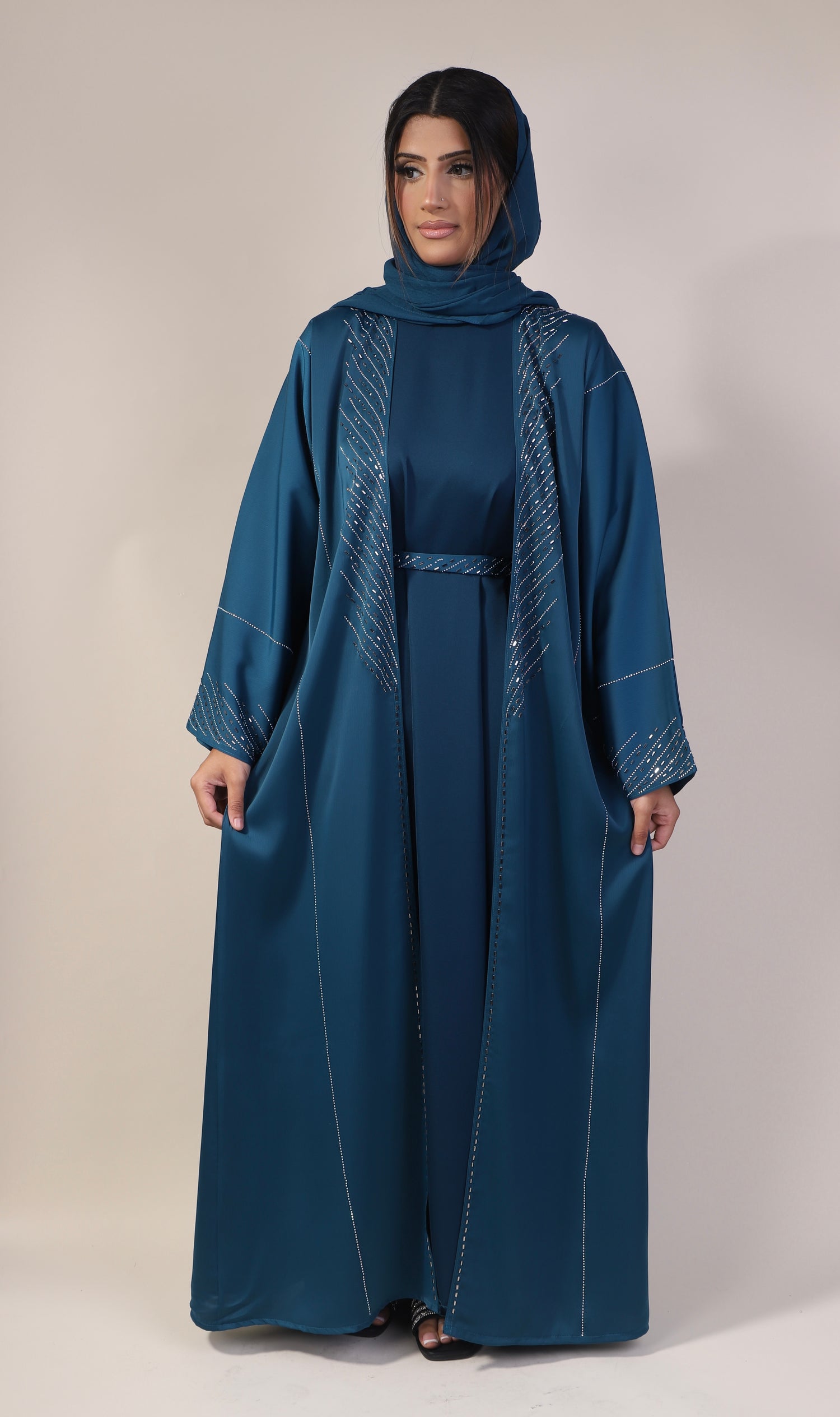 Our fashionable and adaptable black open abayas are prepared to add flair to your outfit. Our selection guarantees your choice while offering comfort and modesty, facilitating effortless mobility. Lightweight, breathable materials like chiffon or Nida are comfortable choices for warmer climates. You can tighten the waist for a more fitting appearance by cinching the lovely clasps or buttons that enable a flowing opening with a matching belt.